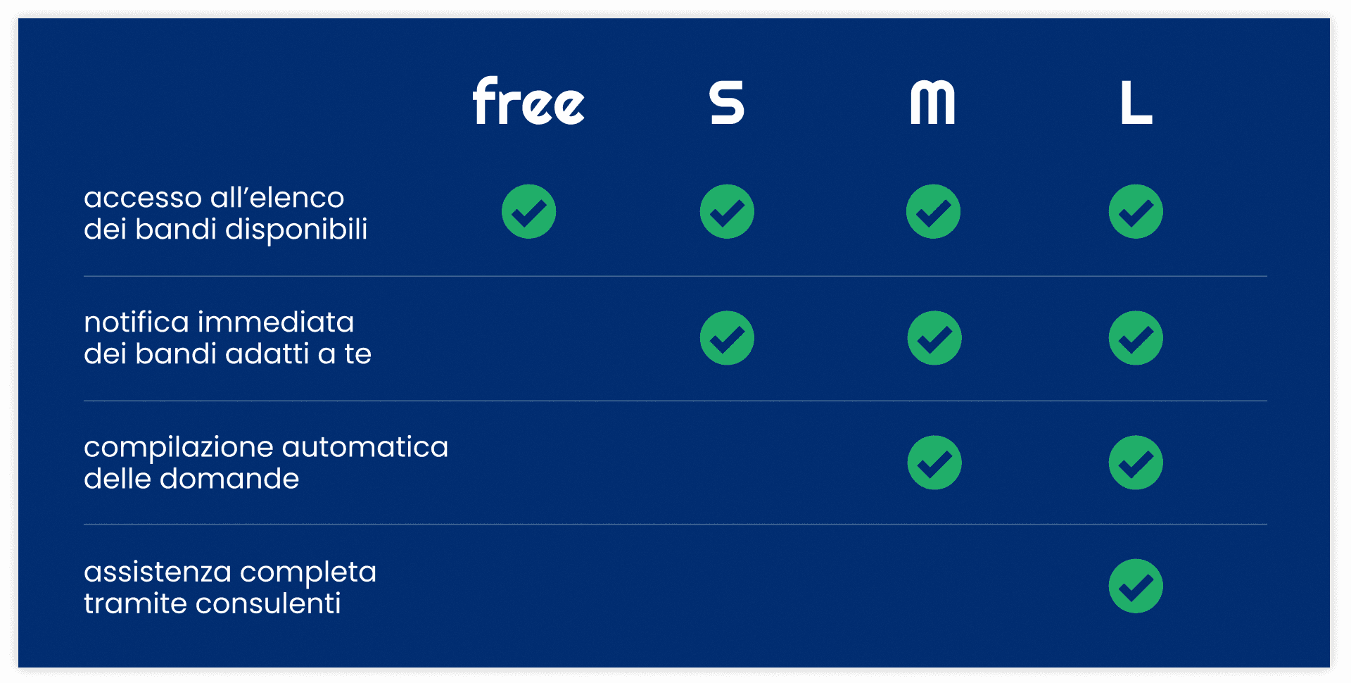 Questa stessa trasparenza ha plasmato la strategia di conversione. L'utente entra gratis, scopre i match trovati dall'AI e tocca con mano il potenziale del sistema. Solo a quel punto sblocca i piani Premium: dal pacchetto "S" (predizione del successo), al piano "M" (pre-compilazione automatica), fino al livello "L", dove un consulente esperto gestisce la pratica end-to-end.