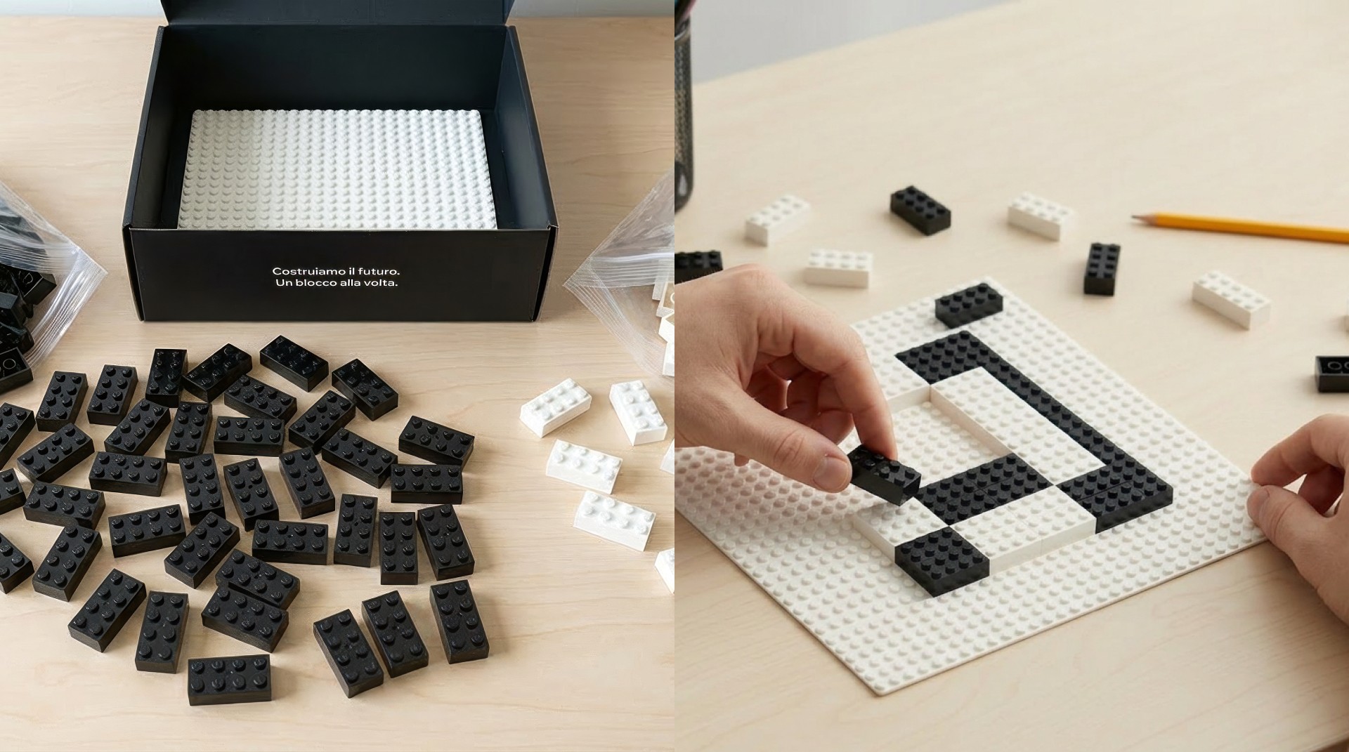 Partire con una scatola nera essenziale, che richiamasse la forma rigorosa del logo, era solo l'inizio. Il punto cruciale era l'aspettativa creata dalla promessa stampata sopra: "Costruiamo il futuro. Un blocco alla volta."