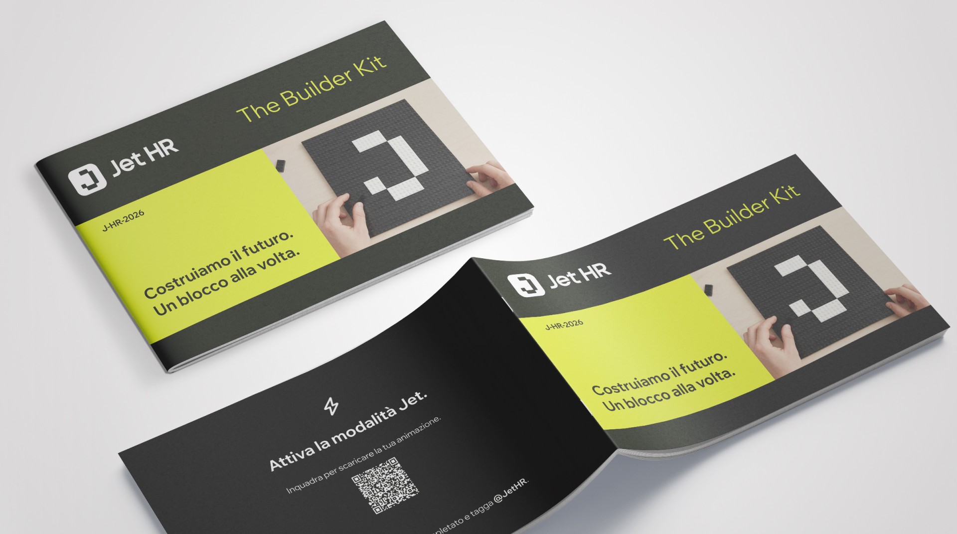 L'ultima pagina del manuale contiene un QR code. Inquadrandolo, il nuovo assunto sblocca un asset digitale esclusivo (una GIF animata, creata interamente in Figma, con un mattoncino che viene messo al suo posto, accompagnata da copy ottimizzati per la piattaforma).