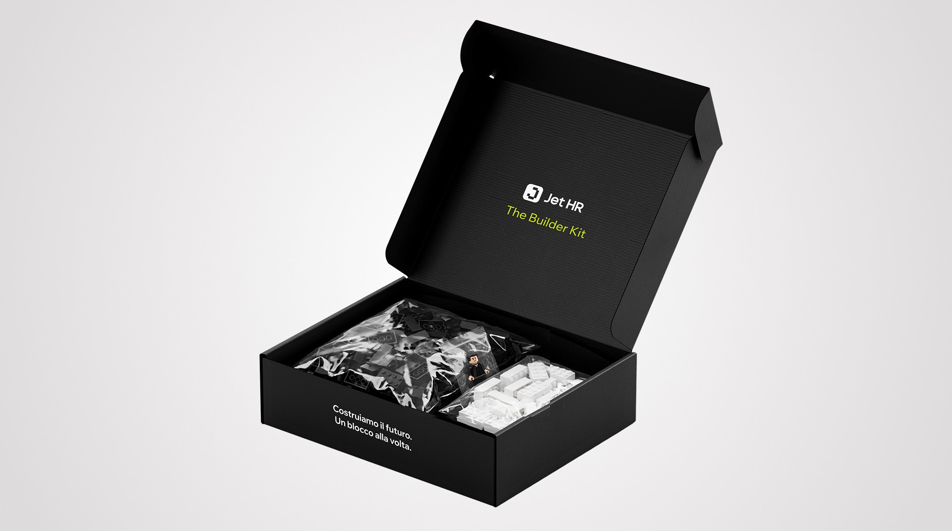 "The Builder Kit" è stato progettato per utilizzare esclusivamente componentistica hardware standard (mattoncini 2x4 classici, baseplate bianca 25x25cm di listino e una minifigure personalizzata) abbinata a un packaging in cartone fustellato su misura.