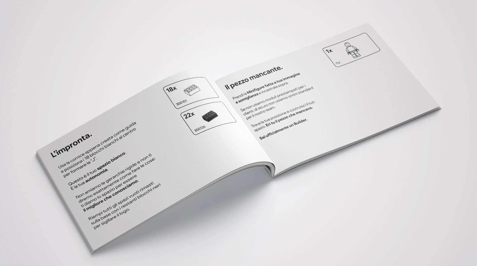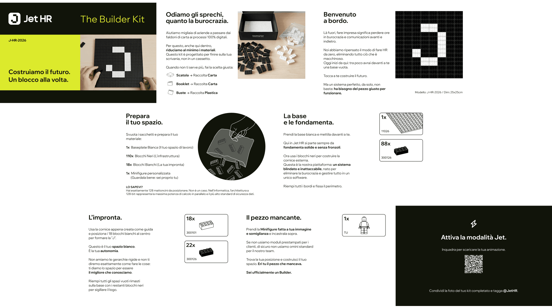 Un manuale di istruzioni impaginato nel classico stile dei mattoncini da costruzione, che non serve solo a guidare l'assemblaggio dei 128 pezzi, ma funge da primo vero "documento di onboarding", trasmettendo il tone of voice e la cultura dell'azienda pagina dopo pagina.