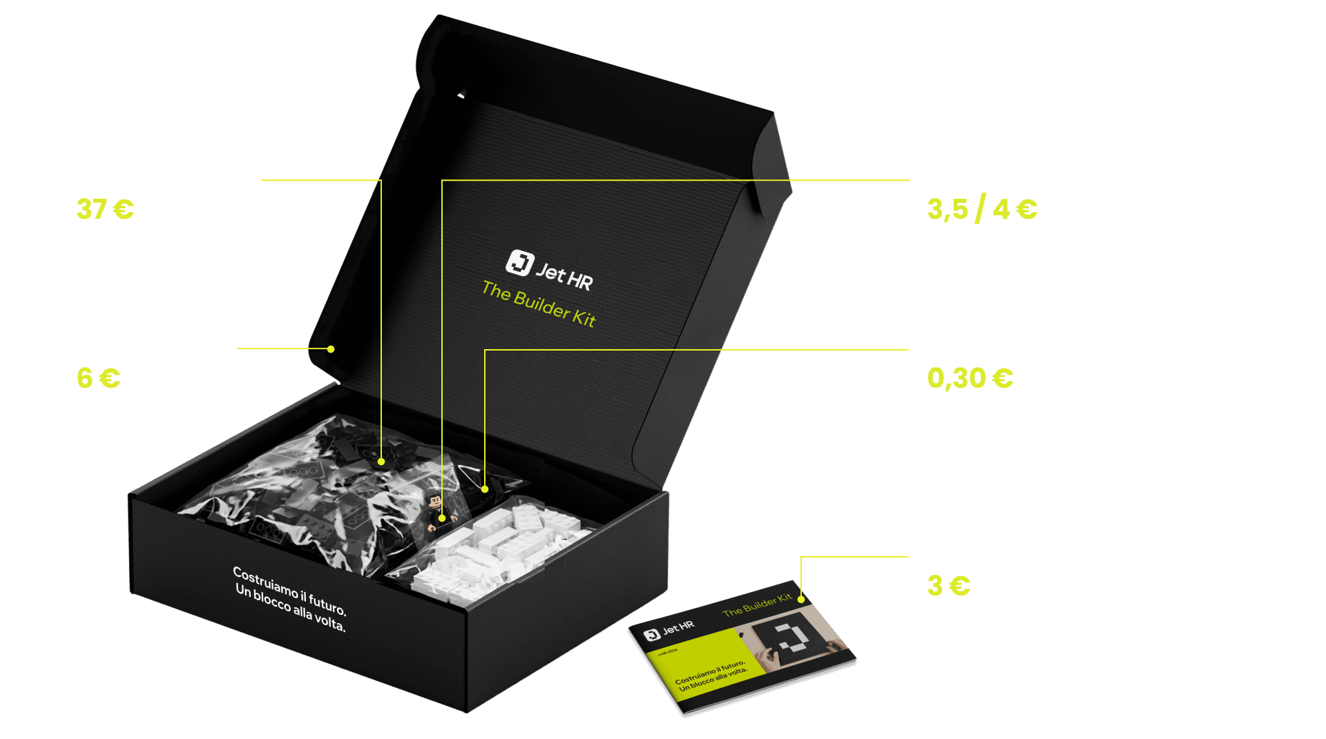 Questa scelta abbatte drasticamente i costi di progettazione e stampi plastici custom, portando il costo stimato del kit a circa 50€ per unità. Una cifra equivalente a quella di una normale felpa aziendale, ma con un impatto strategico e un potenziale di employer branding incalcolabili.